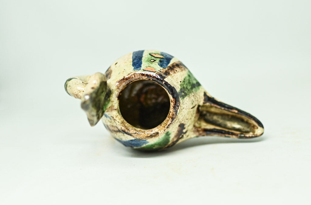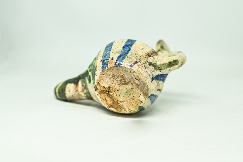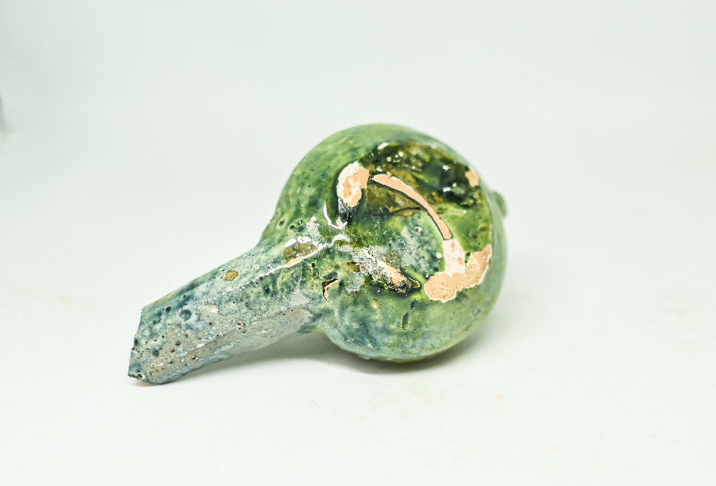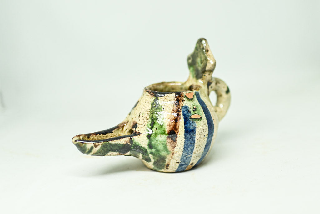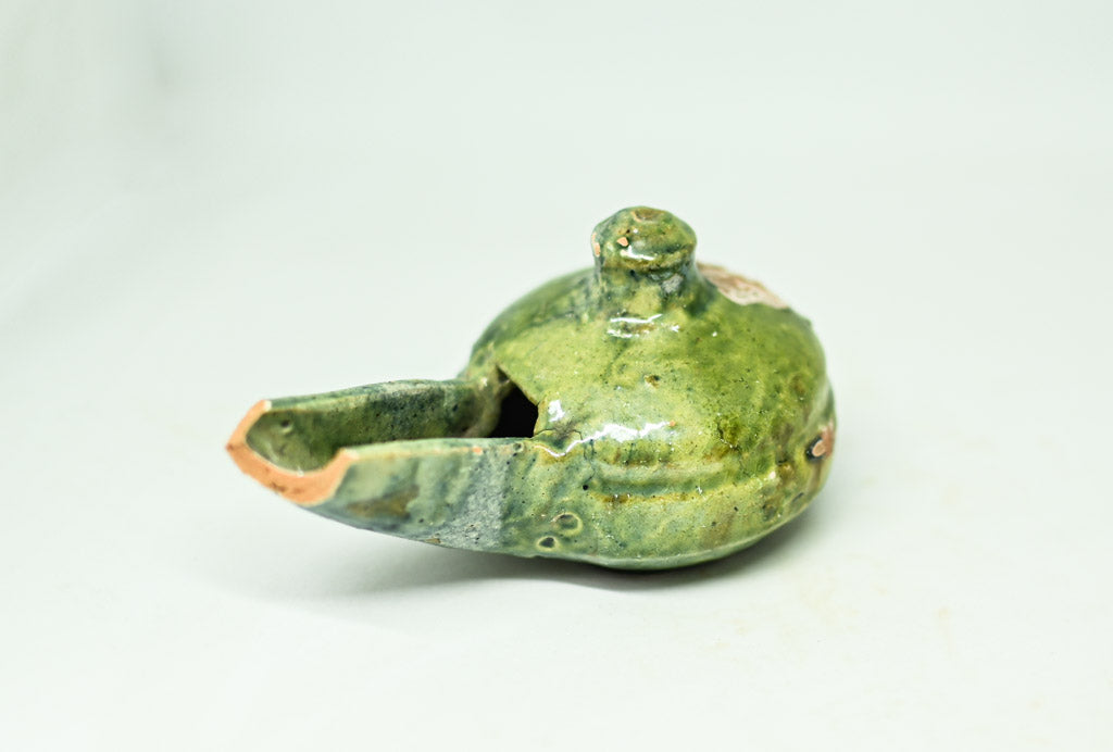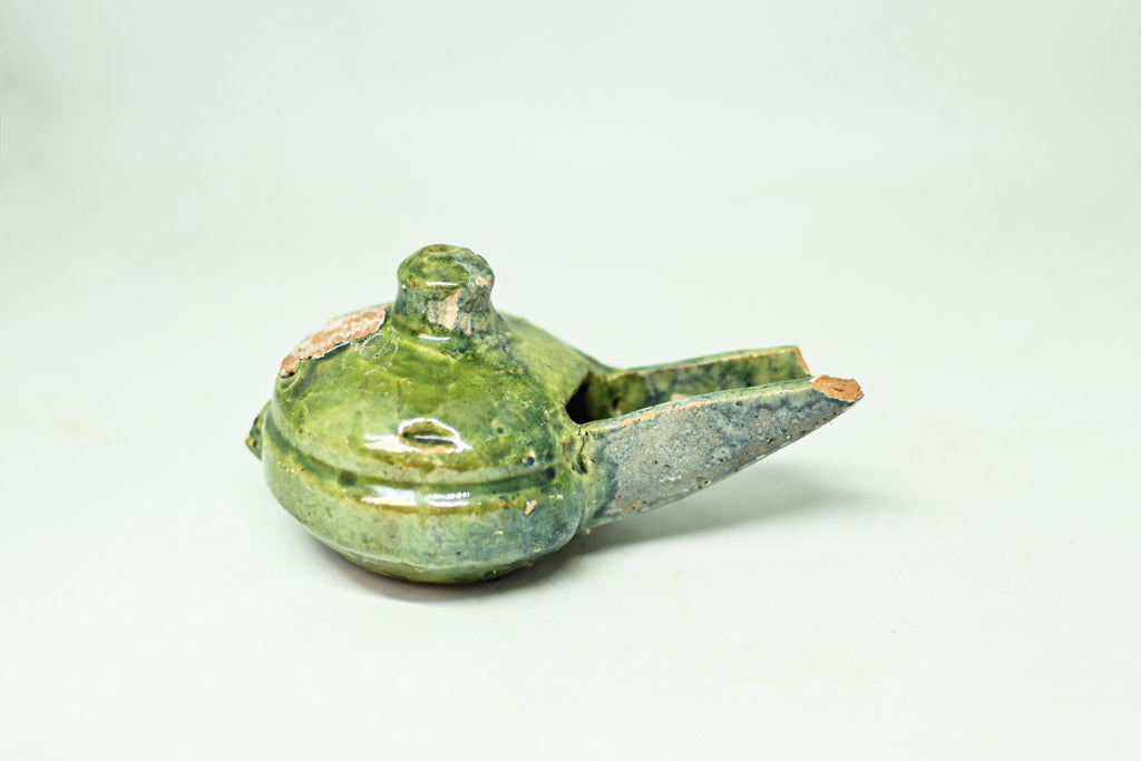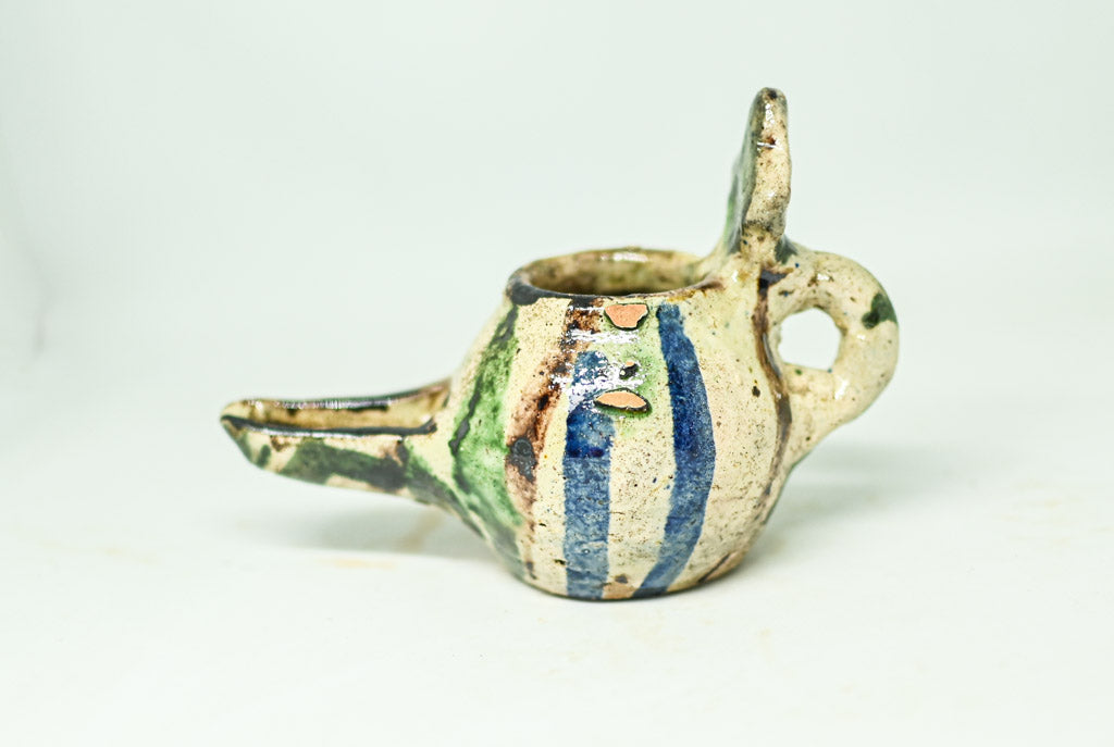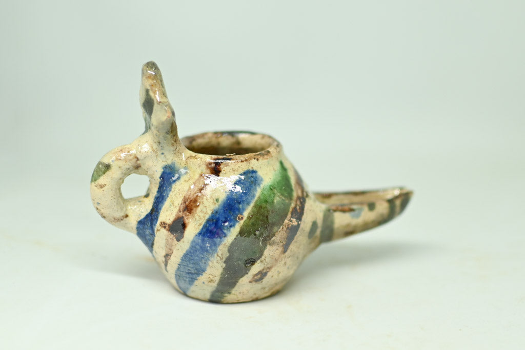 Ta urokliwa kolekcja składa się z trzech ceramicznych lamp naftowych, z których każda charakteryzuje się zaokrągloną komorą z okrągłym otworem lub kopulastą pokrywą. Dwie z lamp posiadają uchwyt pętlowy i wystające podpórki na kciuki, co ułatwia ich użytkowanie. Lampy osadzone na płaskiej podstawie pokryte są kremowym szkliwem, ozdobionym brązowymi i zielonymi plamkami. Trzecia lampa wyróżnia się lśniącym, zielonym szkliwem, które nadaje jej unikalny wygląd, ma jednak drobne uszkodzenie, widoczne na zdjęciach.