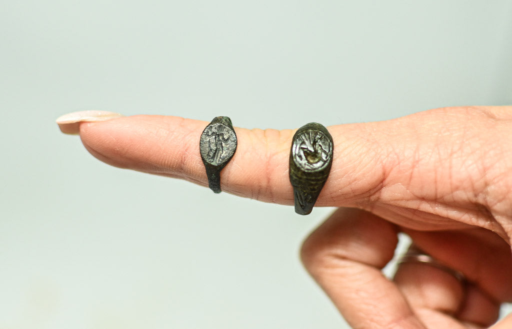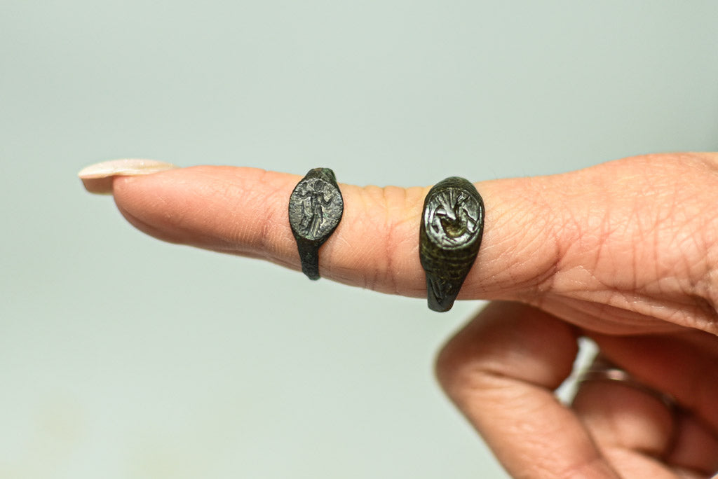 Para starożytnych rzymskich pierścionków z brązu, datowanych na okres I-IV w. n.e., charakteryzuje się pięknie wykonaną dekoracją ramki. Jeden z pierścieni przedstawia wyrzeźbioną postać stojącą na ramce, podczas gdy drugi zdobi wizerunek łabędzia. Te starannie wykonane pierścienie to doskonały przykład rzymskiego rzemiosła i sztuki jubilerskiej, która łączyła estetykę z symbolicznymi motywami.