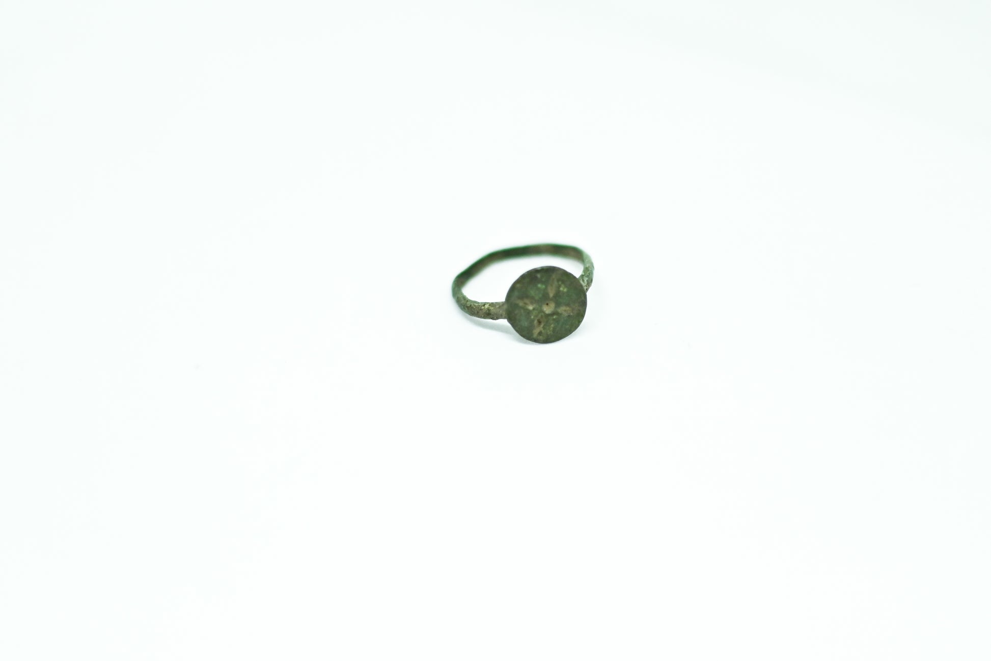 Starożytny rzymski pierścień wykonany z brązu, datowany na okres I–III w. n.e. Pierścień posiada zdobienie, które może przedstawiać motyw kwiatu, co sugeruje, że mógł mieć zarówno znaczenie estetyczne, jak i symboliczne.